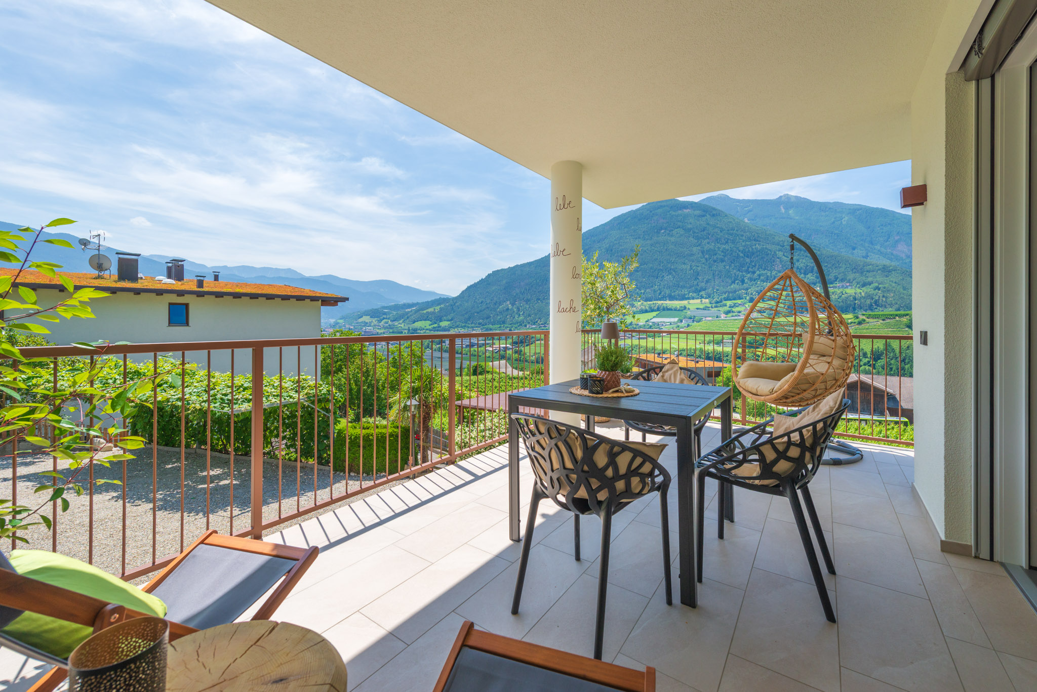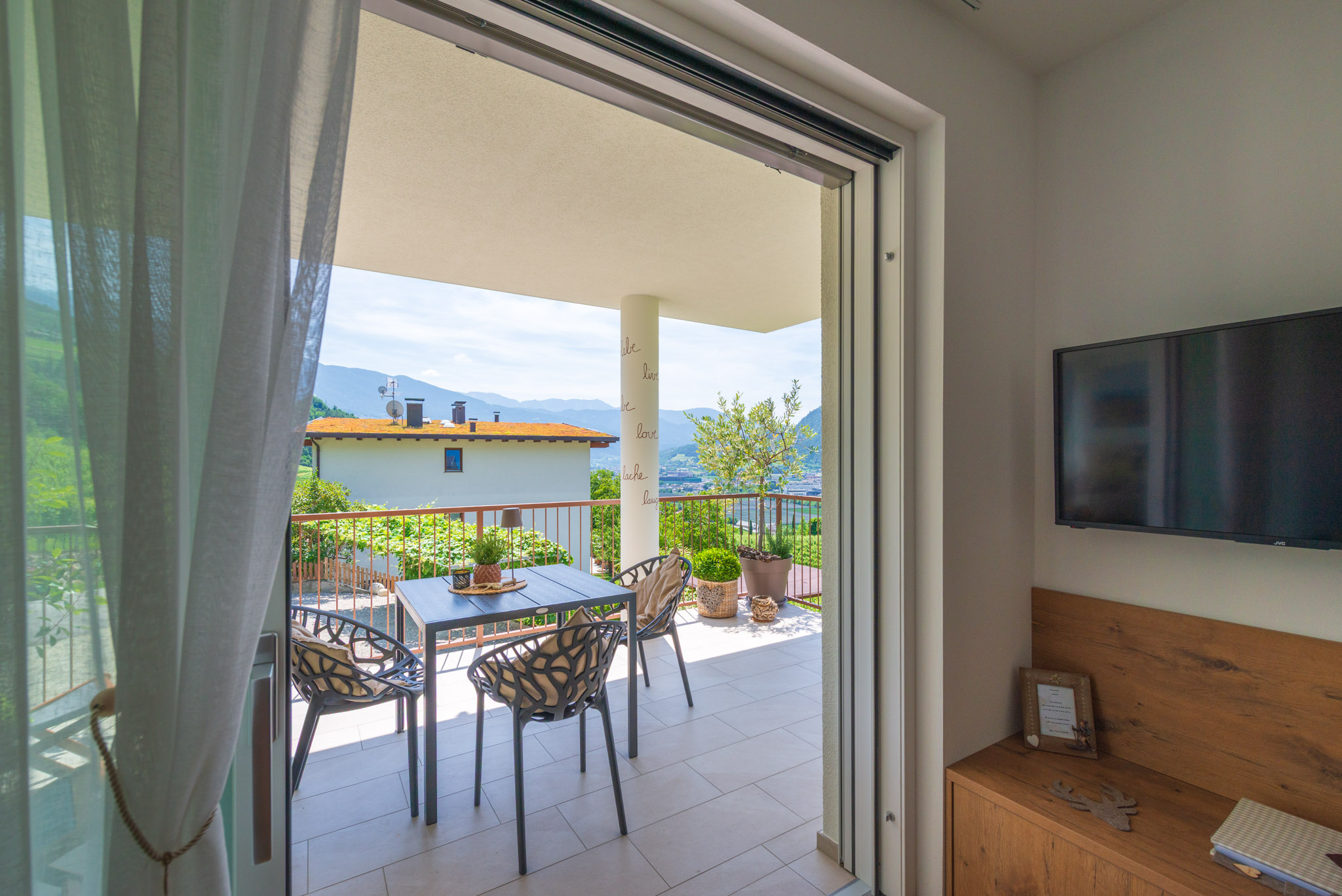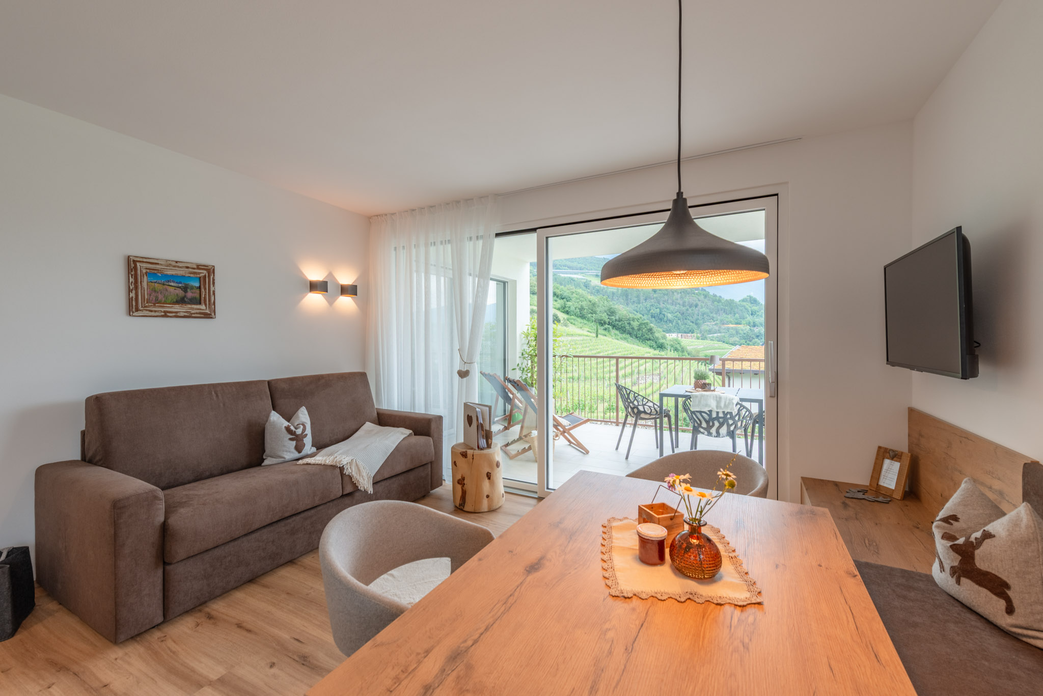 Living room with sofa bed, seating area, induction cooker, refrigerator with freezer, oven, dishwasher, coffee machine, kettle, tea towels, dishwashing liquid, satellite TV, internet/Wi-Fi, safe, two double bedrooms, one with twin beds, with an extra bed available upon request, both rooms with TV, bathroom with shower/WC and bidet/hairdryer/towels, underfloor heating, 15 sqm south-facing balcony with panoramic views, seating and swings.