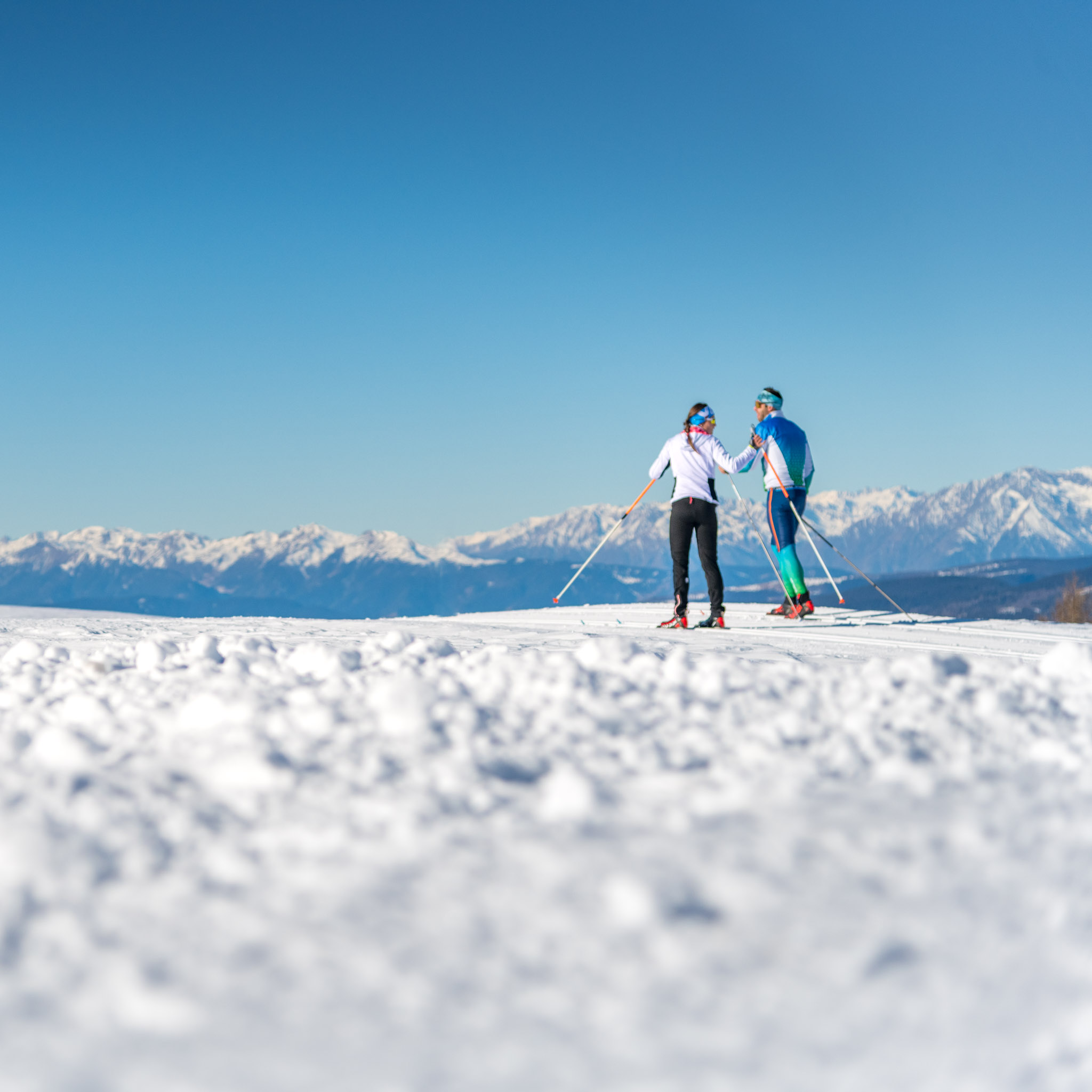 Cross-country skiing enthusiasts will find perfectly groomed trails amidst a stunning winter landscape in the area around Bressanone and the Eisack Valley. The trails on the Rodengo Alm, in Vals, Villanders, at the Würzjoch Pass, in Ridnaun, and on the Seiser Alm are particularly popular. Whether you prefer classic technique or skating, trails for every level await you here – from gentle leisurely trails to challenging high-altitude trails with breathtaking panoramas. Nestled in the snowy mountains, these routes not only offer ideal conditions for an unforgettable cross-country skiing experience, but also numerous places to stop for refreshments and enjoy South Tyrolean hospitality.